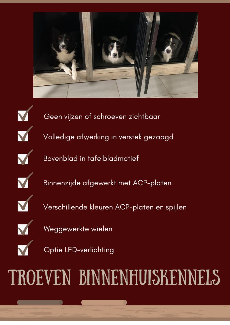 Alle kennels worden op maat en volgens uw wens gemaakt. In onze winkel te Ramsel kan u op afspraak langskomen om ons demo-model te bekijken.